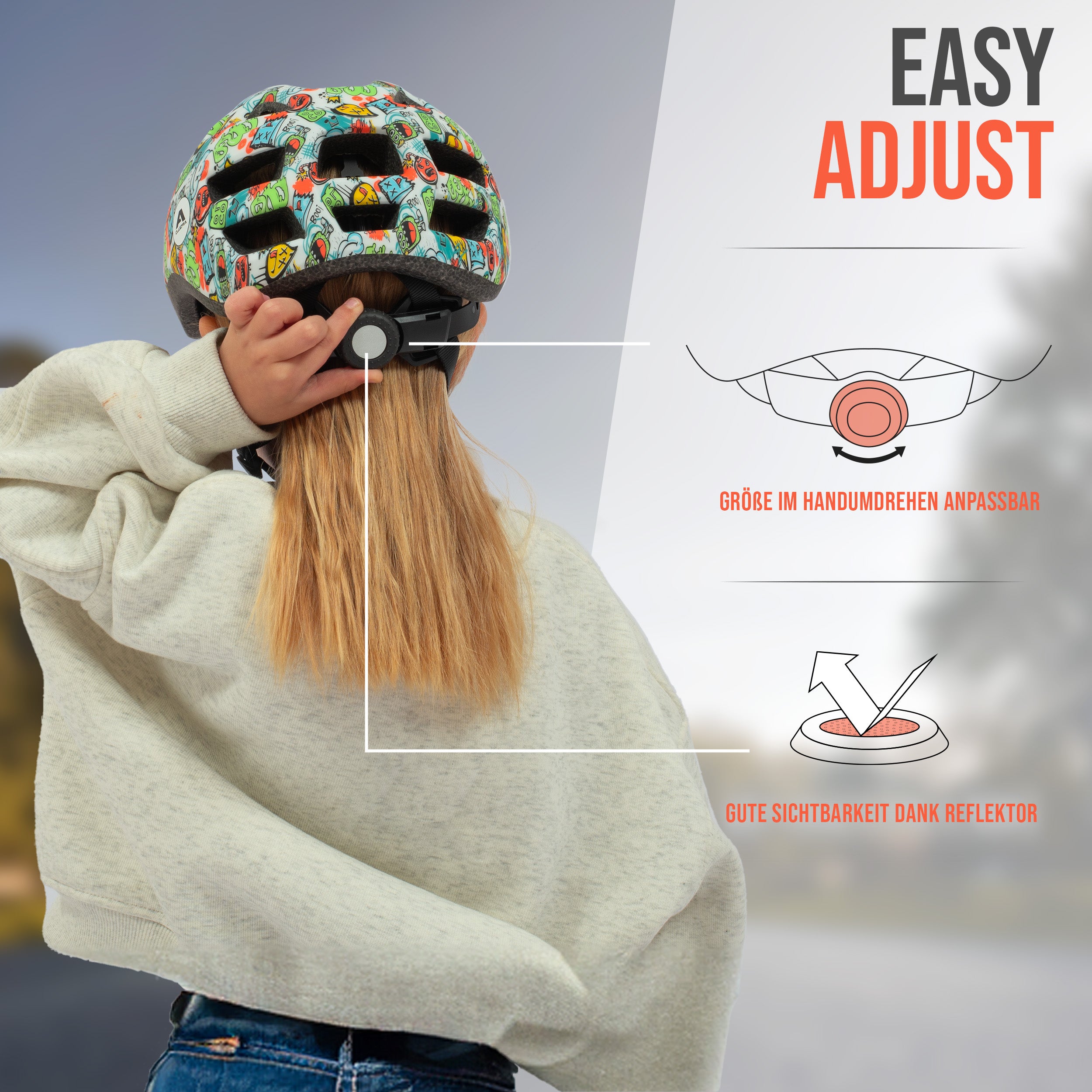 Der Apollo Helm wurde mit einem integrierten Reflektor auf der Rückseite entworfen, um die Sichtbarkeit im Straßenverkehr zu erhöhen und sicherzustellen, dass Ihr Kind immer gut gesehen wird. Sicherheit ist oberstes Gebot, deshalb sind unsere Helme auch größenverstellbar, um einen perfekten Sitz zu gewährleisten.