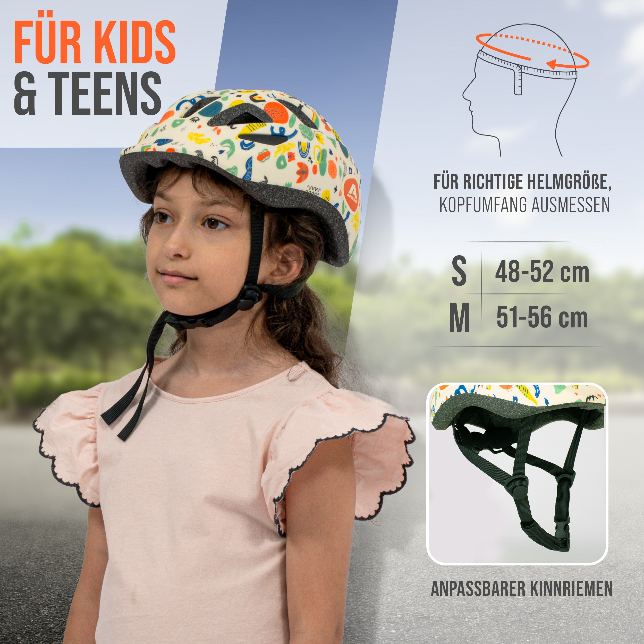 Erhältlich in den Größen S (48 - 52 cm Kopfumfang) und M (51 - 56 cm Kopfumfang) passt der Apollo Helm perfekt zu Kindern ab 3 Jahren und Jugendlichen bis zu einem Alter von 16 Jahren. Vielseitig einsetzbar, ist dieser Helm sowohl für Fahrradfahrer als auch für Skateboarder, Rollschuh- oder Inlinefahrer geeignet.