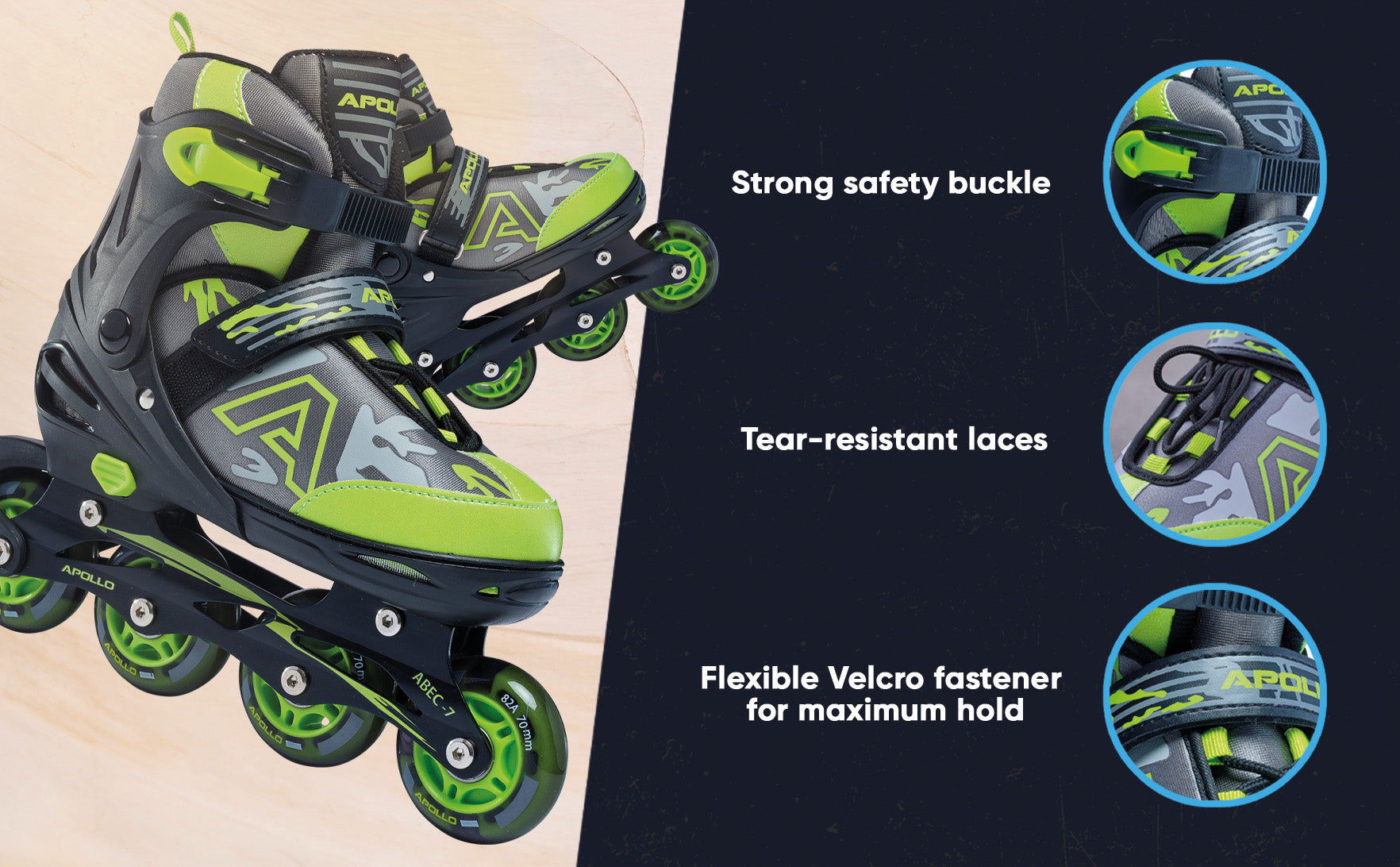 SICHERER HALT: Sicherheitsschnalle, Klettverschluss und Schnürsenkel sorgen für sicheren Halt. Diese Rollerskates können von Kindern und auch von Erwachsenen zum Skaten genutzt werden.