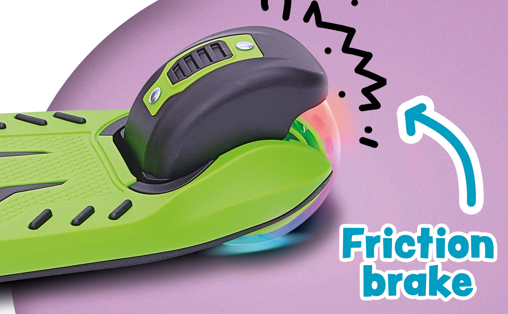 Ein besonderes Highlight sind die leuchtenden LED-Rollen, die durch Bewegung aktiviert werden und keine Batterien benötigen. Die Reibungsbremse am Hinterrad sorgt für sicheres und einfaches Abbremsen.